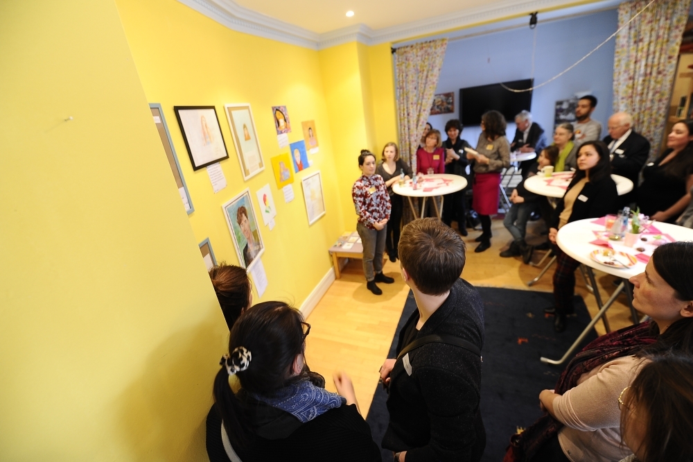 Charity-Tisch des FeM Mädchen*Treffs mit Schutzengel-Armbändern, hübschen Taschen und selbstgestrickten Socken.